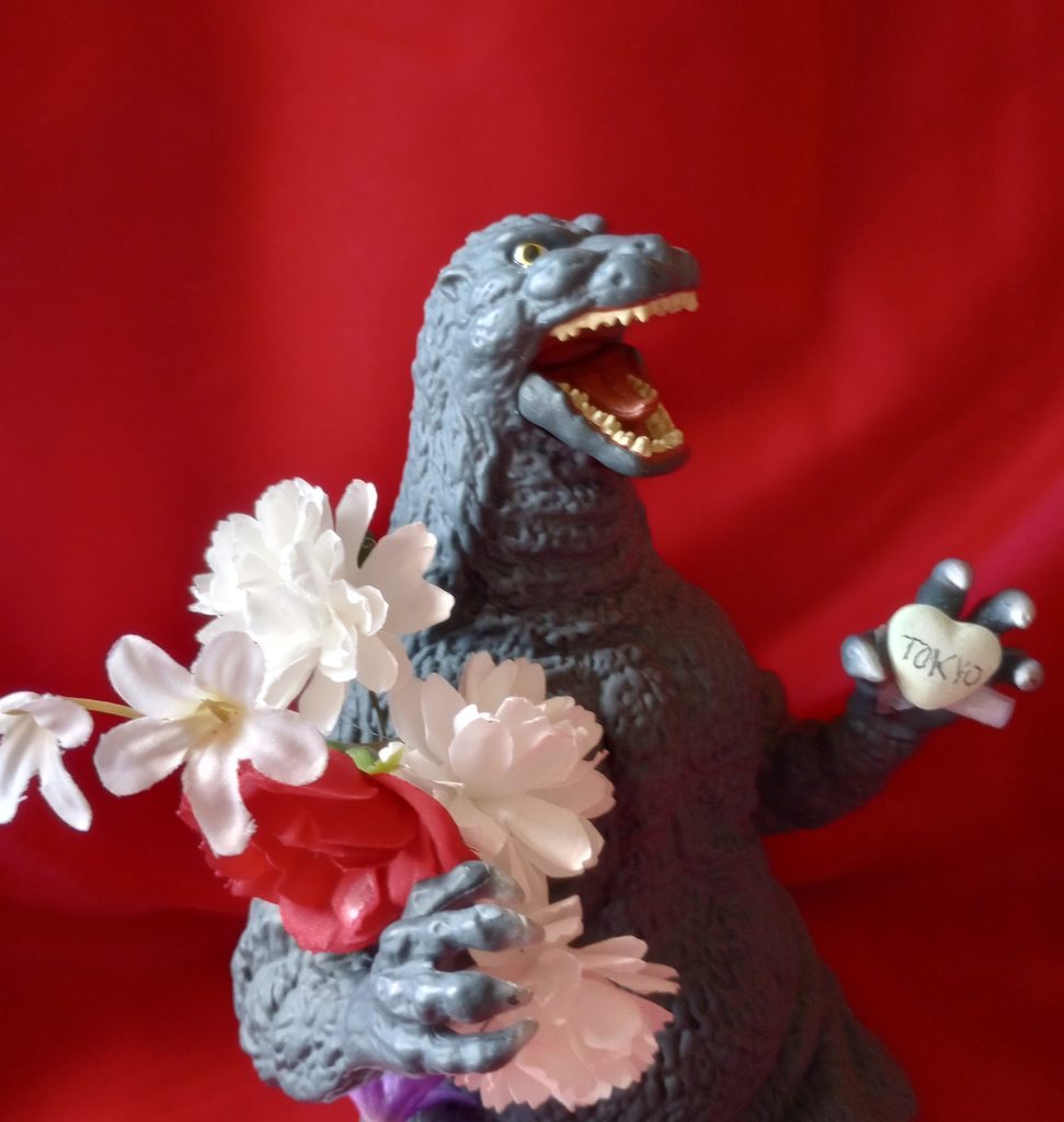 There is the standard sort of holiday decor, it can be purchased anywhere, from craft stores, to department stores, to grocery stores. And then there is my take on holidays, in which I spend minutes arranging a plastic Godzilla into a scene of holiday magic. Here is one such photo, which I took this year for Valentine’s Day. As we all know, the only sweetheart of Godzilla is Tokyo.