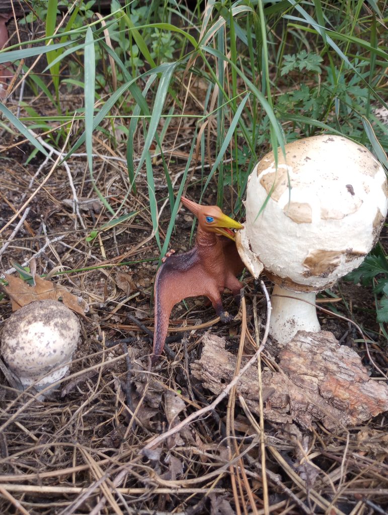 The next day the puffball has fully opened and I imagined that Archy would come the rescue of Pteri. This little inexpensive pterosaur has once again been a source of amusement and art. I have held, that almost any picture is improved by adding a pterodactyl, and here is proof.