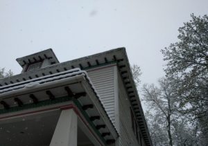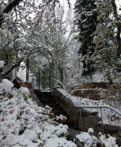 The Little Engine that Could graces the nearby park. Built in the late 1880’s this engine powered a cog railway to carry tourists up to admire the view. On a day such as today they would not have been able to see much besides softly falling snow.
