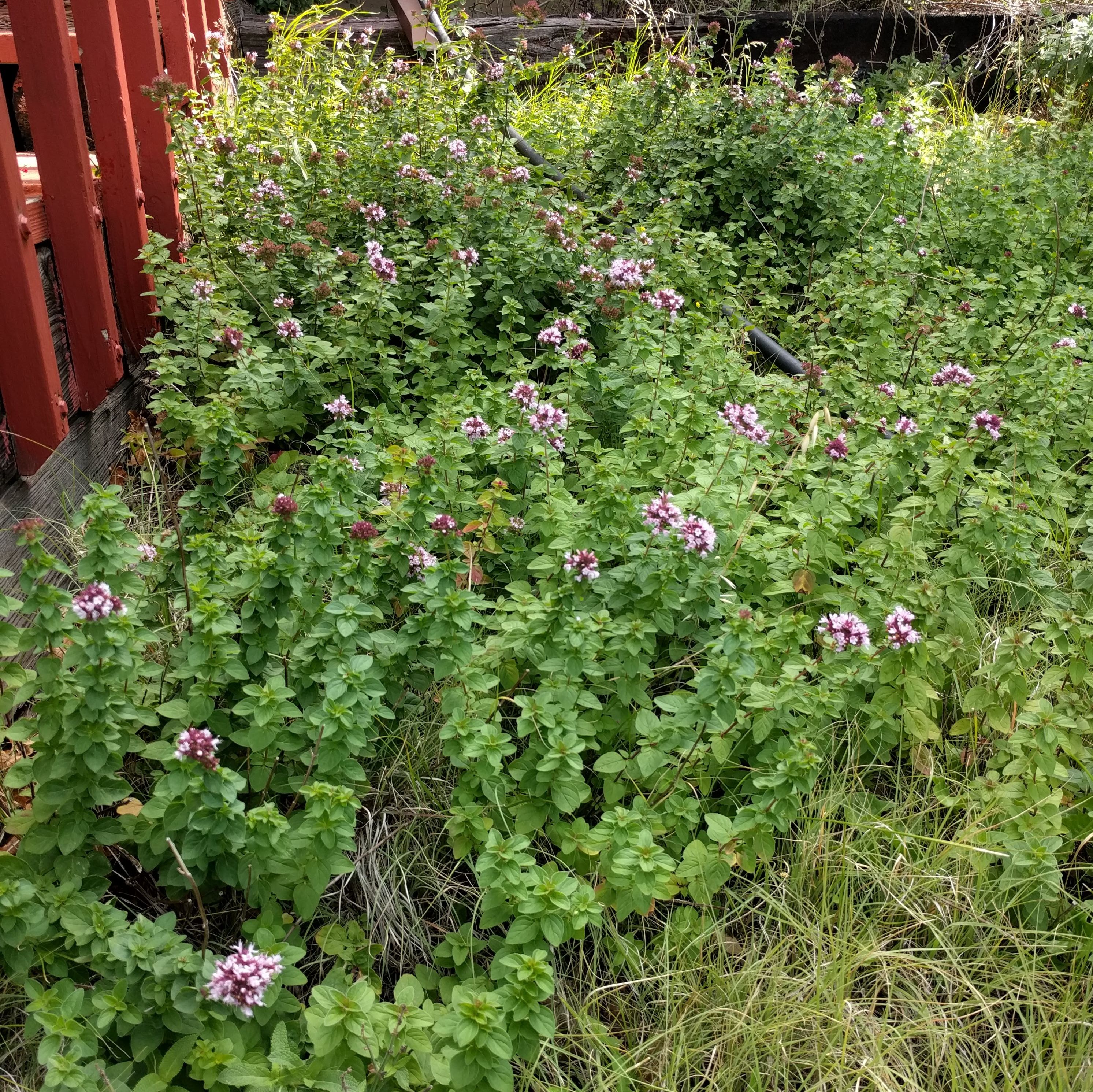 Oregano flourishes near the front steps. A favorite of the bees, the plants sprang up from seeds that leapt over the concrete. Every year this patch gets a little bigger, perhaps it will completely take over my yard in due course. That’s not a black snake hiding among the plants, it’s the hose. (I do water things every now and again).