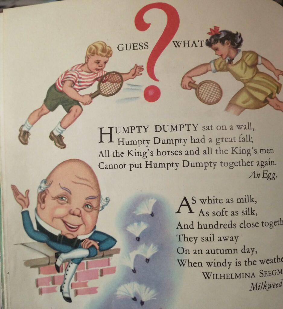 There are a variety of explanations offered up as to the meaning of this rhyme, it’s a drink of brandy boiled with ale (sounds awful), a short and clumsy figure, or various persons, but the true origins are unknown. The real mystery is how the King’s horses were expected to do the job.
