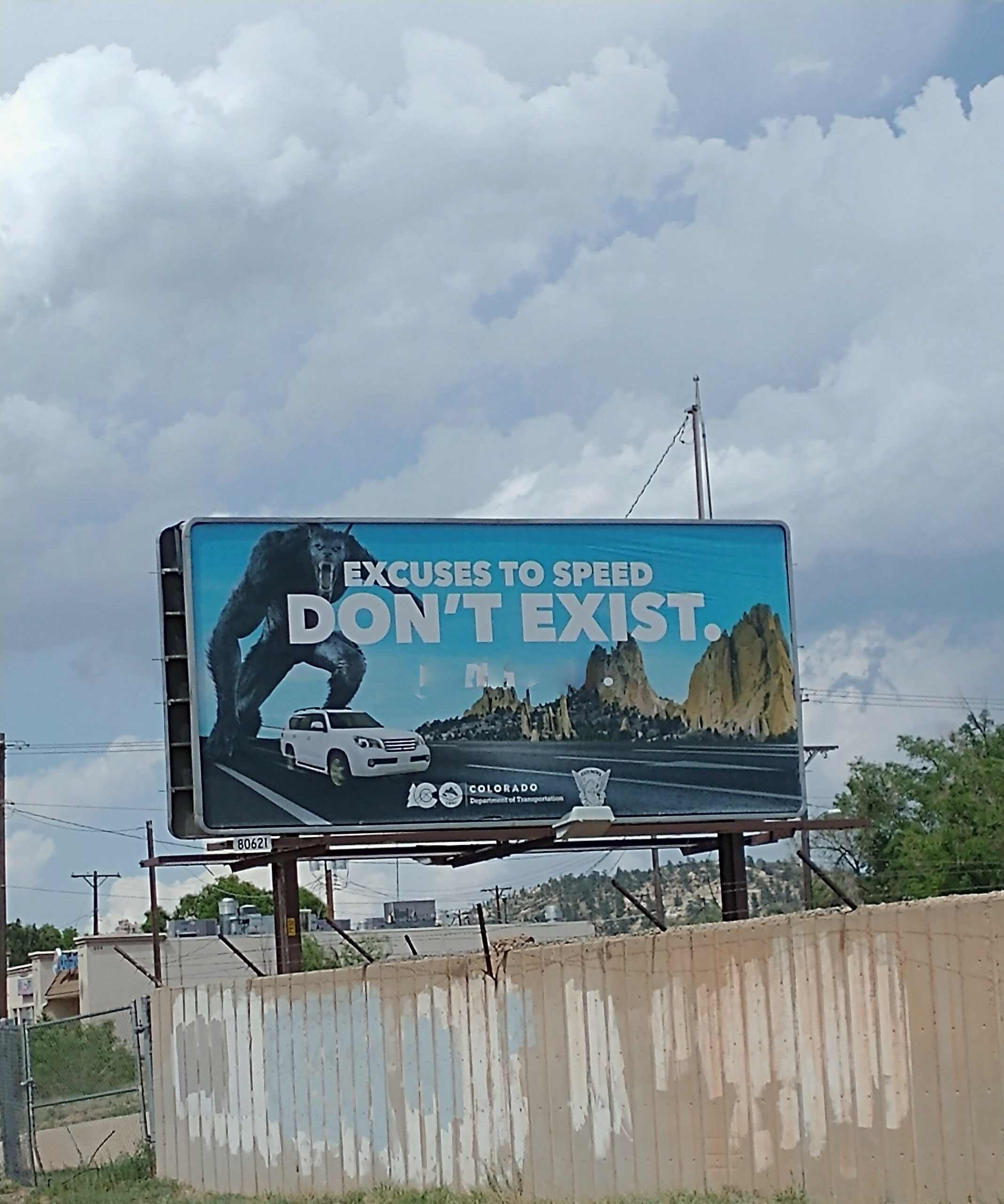 CDOT has put up this enigmatic billboard. I am not sure if this refers to the speed of flying saucers (no greater than 186,000 miles/second) or the posted road signs. If one were to drive the actual speed limit one would be holding up traffic, so the moral is “no excuses?”.