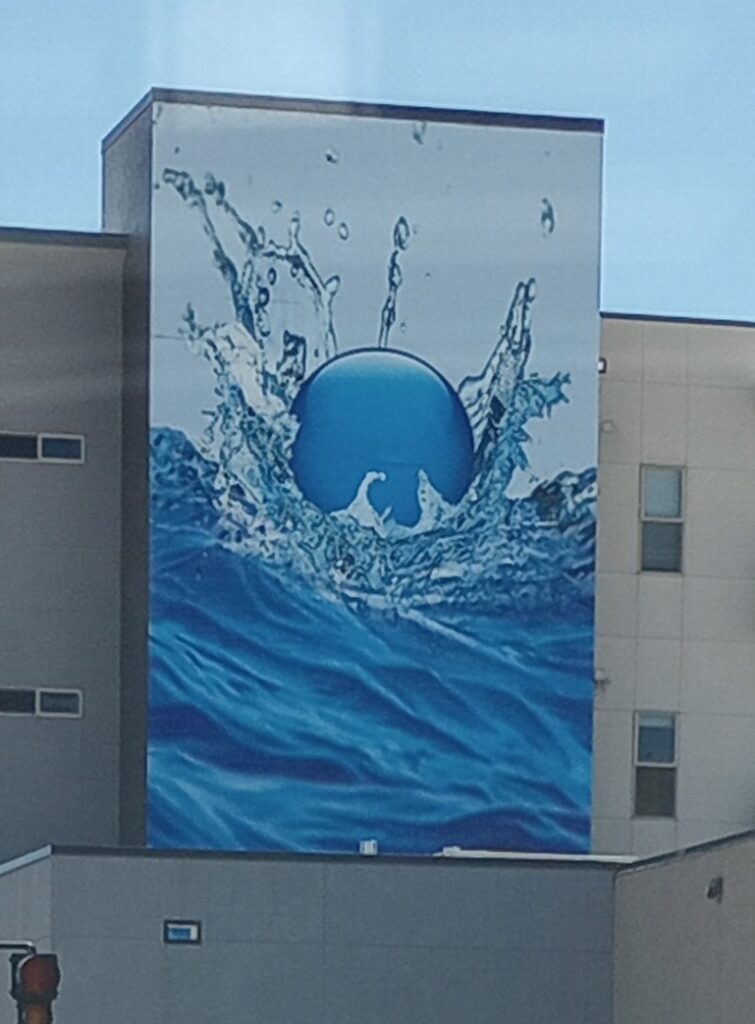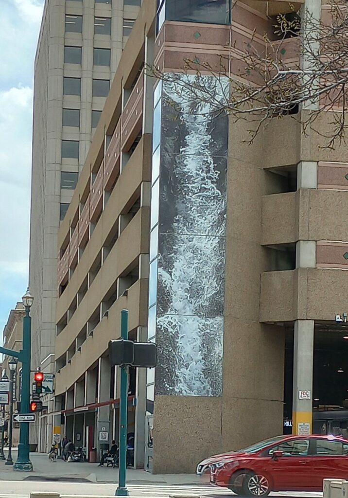 Our city likes to follow the current trends for downtown art and attractions, so they have been mimicking graffiti by adding paintings to the town. This piece is of water is cascading down the side of the bus depot, where those unfortunate enough to be forced to use our pathetic public transportation wait.