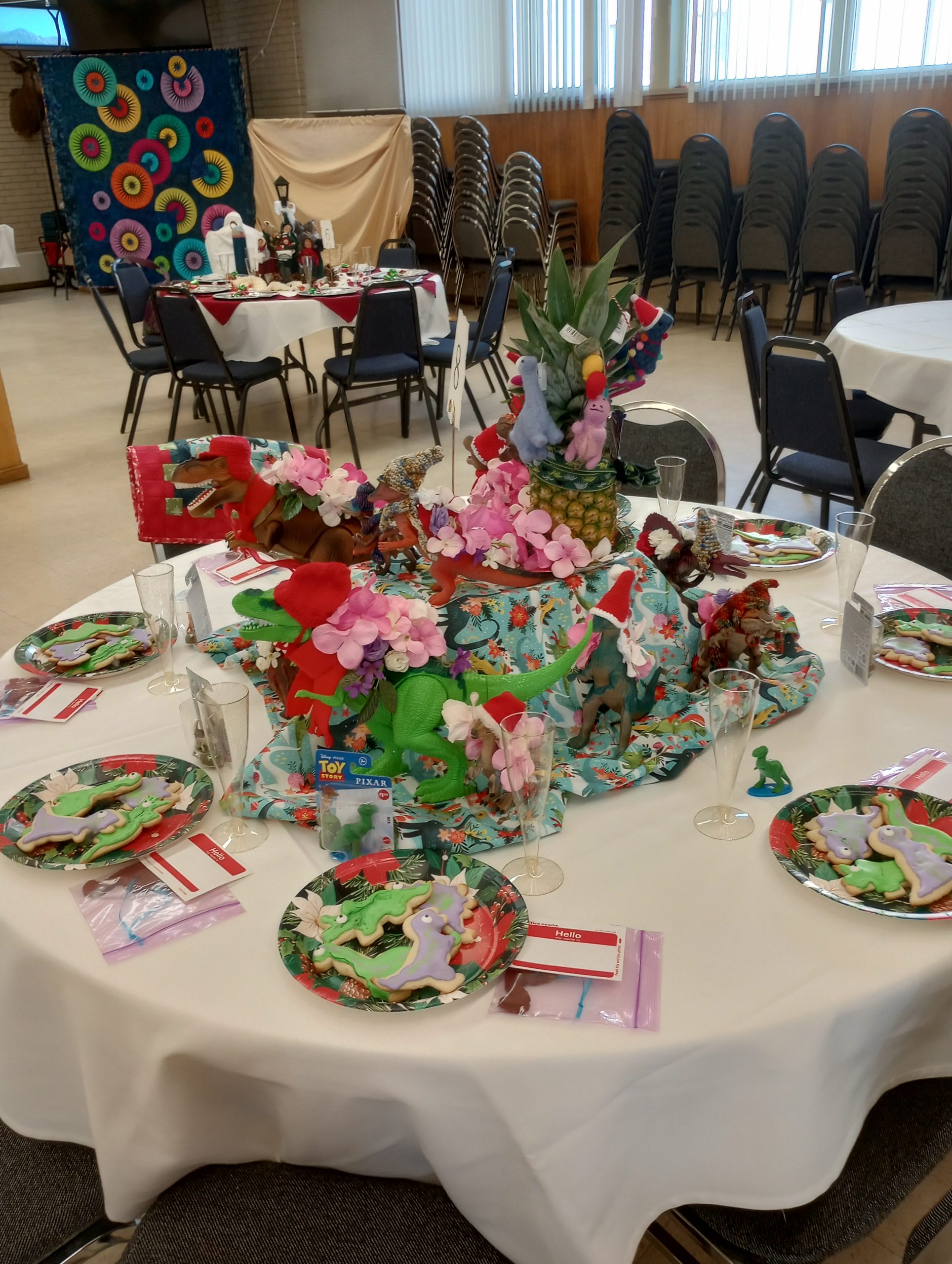 Let me state right off the bat that I am not really the ladies luncheon sort of person. I am not crazy about making small talk with people I don’t know well, and I have an idiosyncratic decorating style. The last one of these that I attended was years ago and I remember it as being no fun. So why was I here? A friend asked me to do a dinosaur themed table, and how could I refuse? What this meant was that we were to decorate a table in a festive manner for a Christmas luncheon and provide some sort of party favor.