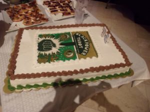 There was the usual sort of swill to drink, by which I mean delicious Bulgarian wine. They had a sign to indicate that one needed to show proof of age to be able to imbibe, but they forgot to ask me for some reason. 😉 And of course there must be some sort of nibbles to go along with event. There were roasted beet appetizers and this lovely cake, the shadow is me, just drifting through this event.